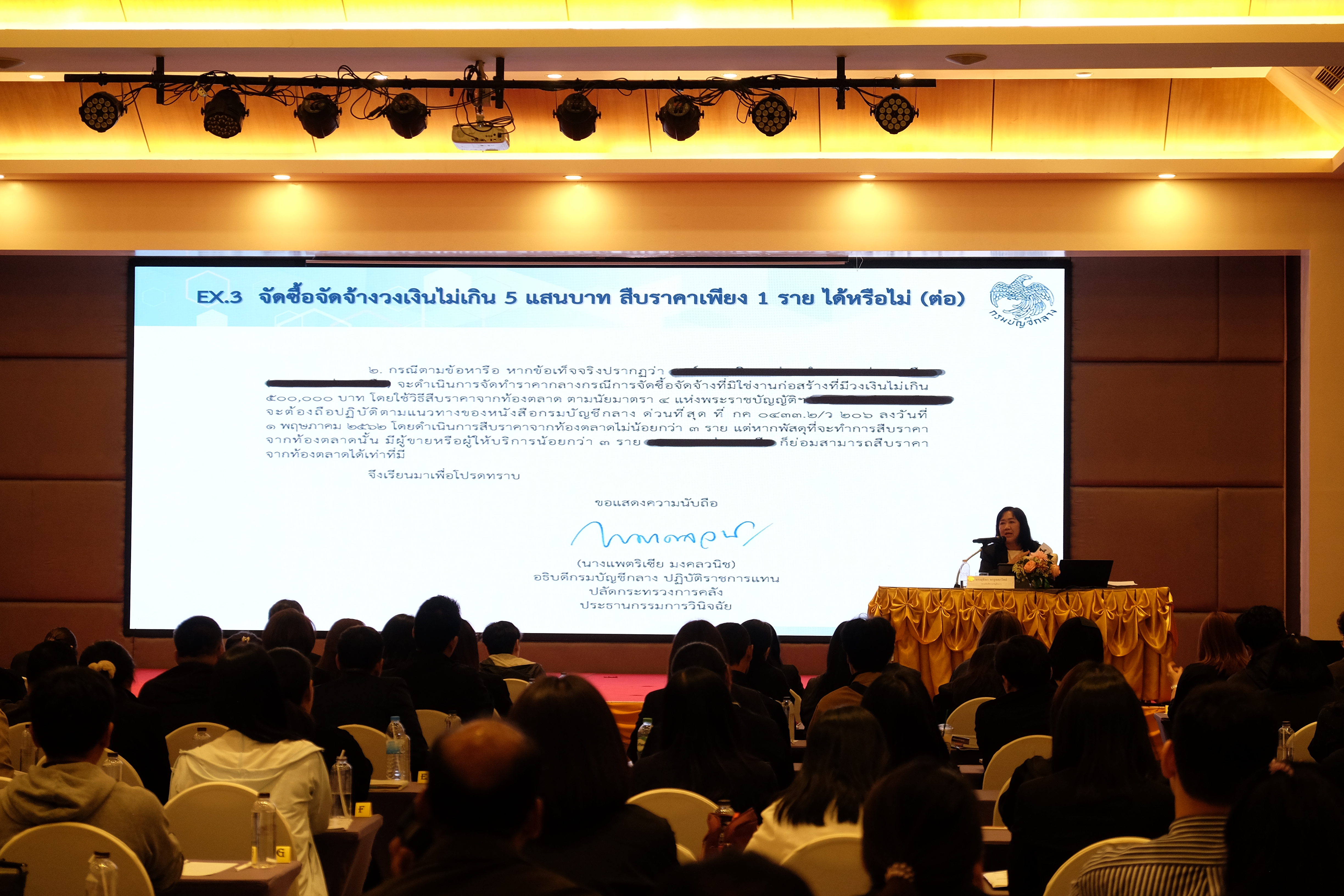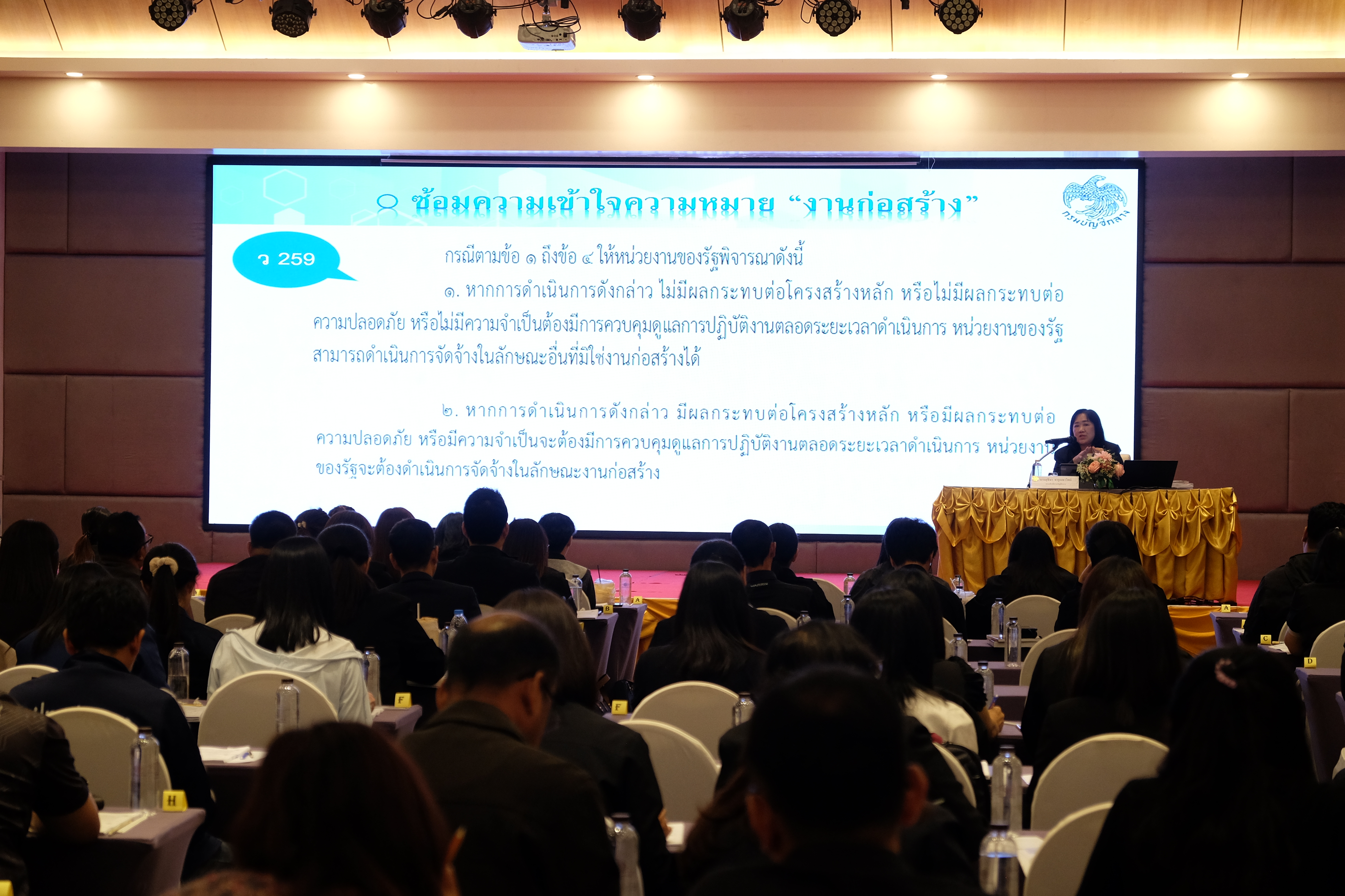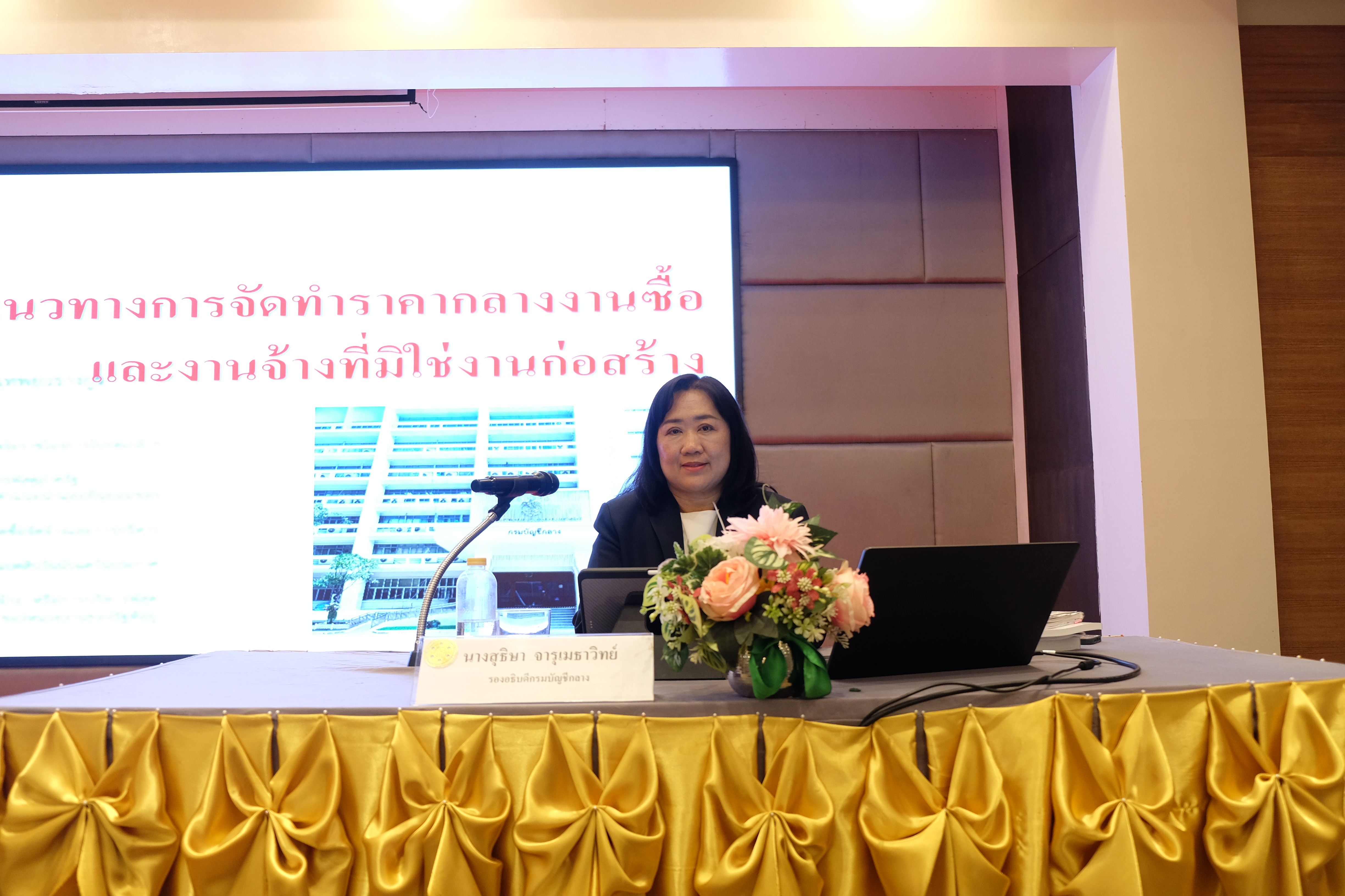1. เรื่อง "แนวทางการจัดทำราคากลางงานซื้อและงานจ้างที่มิใช่งานก่อสร้าง วิทยากร นางสุธิษา จารุเมธาวิทย์ รองอธิบดีกรมบัญชีกลาง"